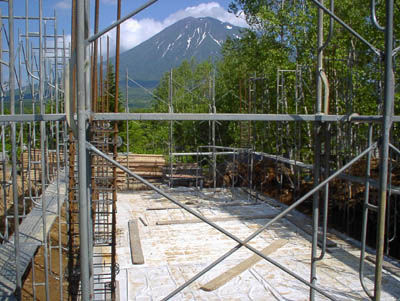 羊蹄山をバックに背後から足場と柱の配筋の様子です。