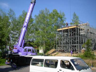 撤去された二階の壁の型枠をクレーンで下ろす。