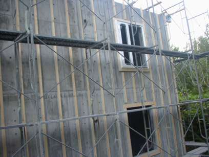 窓の開口の周りに断熱材と木材をコンクリートに固定し、それに窓枠を設置する。