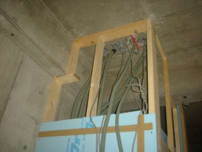 電気の配線工事(途中)。写真はエントランス上部の配線の集まるところ。