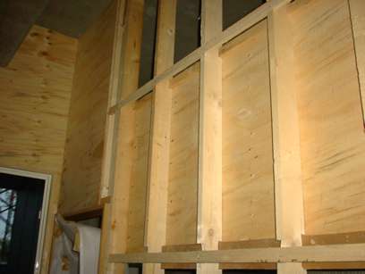 内部の木工事。トイレの壁の製作途中。