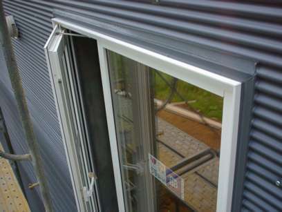 昨日作業の窓周りのコーキングの様子。今日は前方のステージ部の足場撤去された。